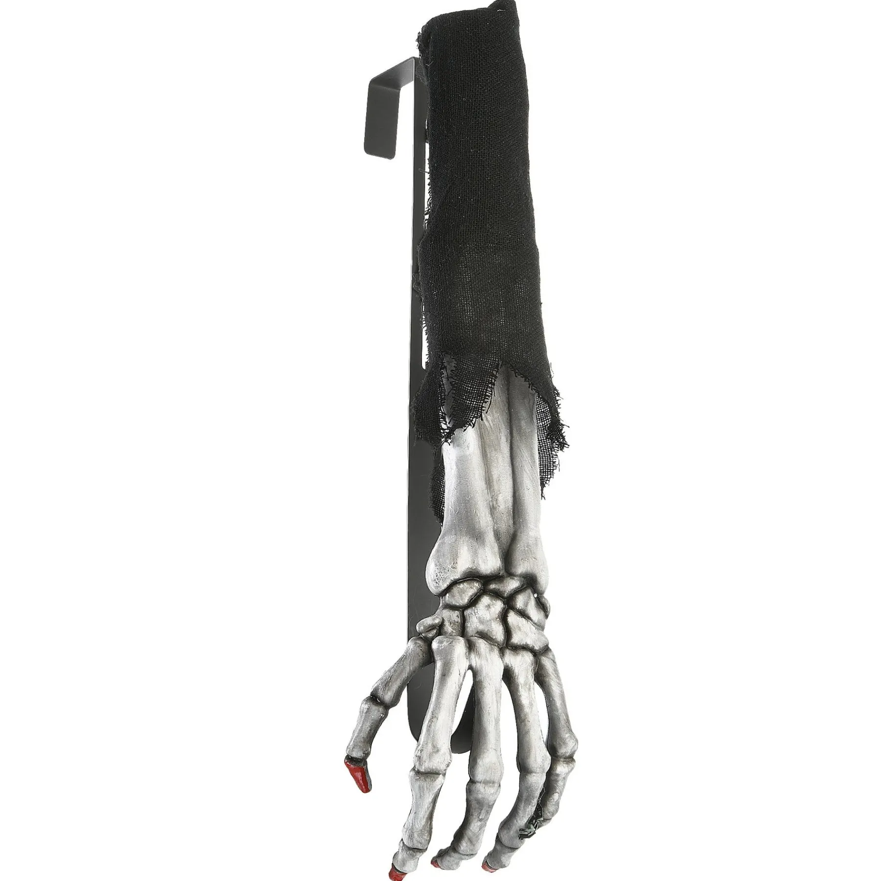 - Halloween-Themed Wreath Hanger Made To Resemble A Skeleton’S Hand Holding The Wreath. The Skeleton’S Arm Is Covered By Frayed, Black Fabric And The Bones Are White With Red Fingertips.