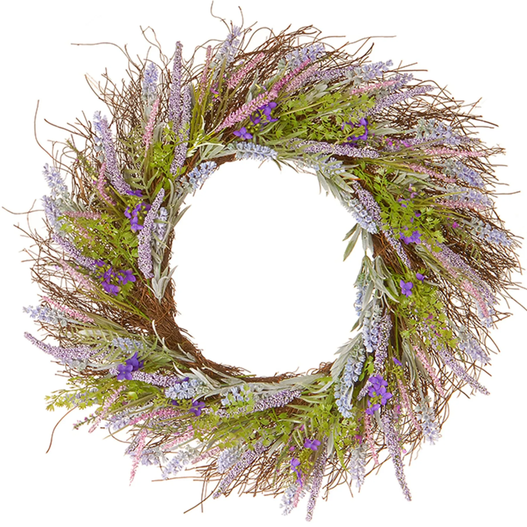 National Tree Company Flower Wreaths^ Artificial Hanging Wreath, Woven Branch Base, Decorated With Purple Lavender Blooms, Flowing Green Stems, Small Flower Blooms, Spring Collection, 24 Inches