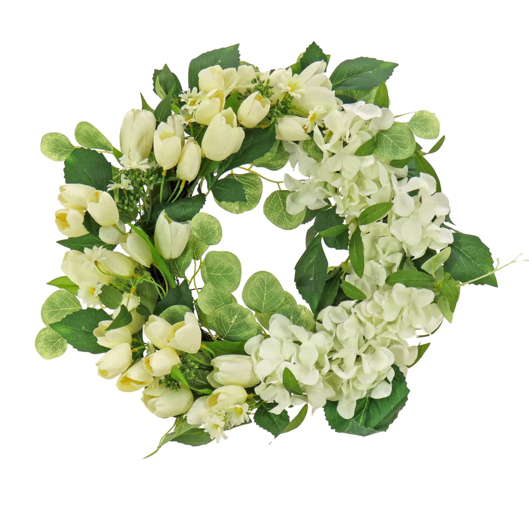 - This Artificial Wreath Decoration Is Decorated With Tulip And Buttercup Blooms, Seed Pods And Flowing Green Stems.