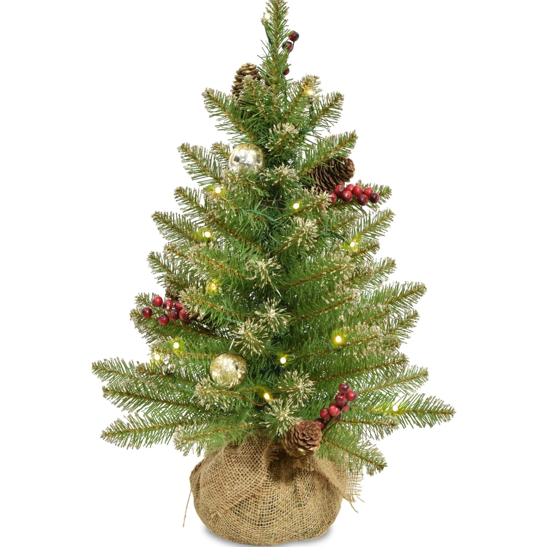 This Dunhill Fir Pre-Lit Green Christmas Tree Is 2 Feet Tall With A 16 Inch Base Diameter. Flocked With Pine Cones, Berries And Frosted Branches For Added Decoration And Featuring Tens Of Individually Crafted Branch Tips To Create Full Bodied Branches. Features 15 Battery Operated, Warm White Led Lights And A 6/18 On/Off Timer. The Lights Are Strung On The Tree Before Packaging, Offering An Easier, More Convenient Set Up. This Tree Features Pre-Attached, Hinged Branches That Drop Down For A Simple Set-Up And Fold Back In For Quick And Convenient Storage. Set Aside 45-60 Minutes To Properly Shape The Tree By Peeling Back The Branches And Pulling The Tips Apart. Constructed With Sturdy, High Quality Materials, Hypo-Allergenic, Fire-Resistant Needles, This Tree Is Built To Bring Holiday Cheer For Years To Come. Includes A Cloth Bag Base. At National Tree Company, We Believe That Special Holiday Memories Do Not Have To Be Far And Few Between. This Christmas Season, Let Our Decorations Transform Your Home While You Focus On Creating More Of Those Magical Moments.