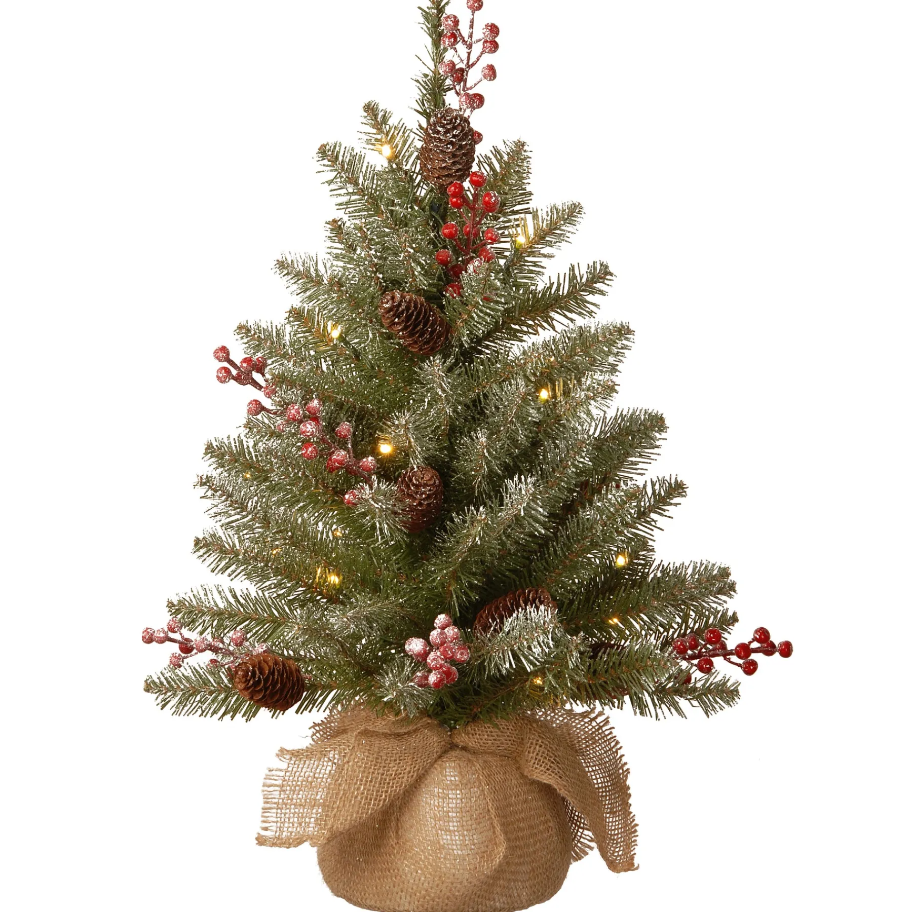 This Evergreen Tree Features Branch Tips, Red Berries And Pine Cones All Sprinkled With Soft Snow. It Is Pre-Strung With 15 Battery-Operated Warm White Led Lights That Are Energy-Efficient And Long Lasting. 6 Hours On/18 Hours Off Timed Operation. Seated In A Burlap Bag Base For A Rustic Look, This Small And Compact Tree Makes A Perfect Holiday Accent To Your Seasonal Decorating.