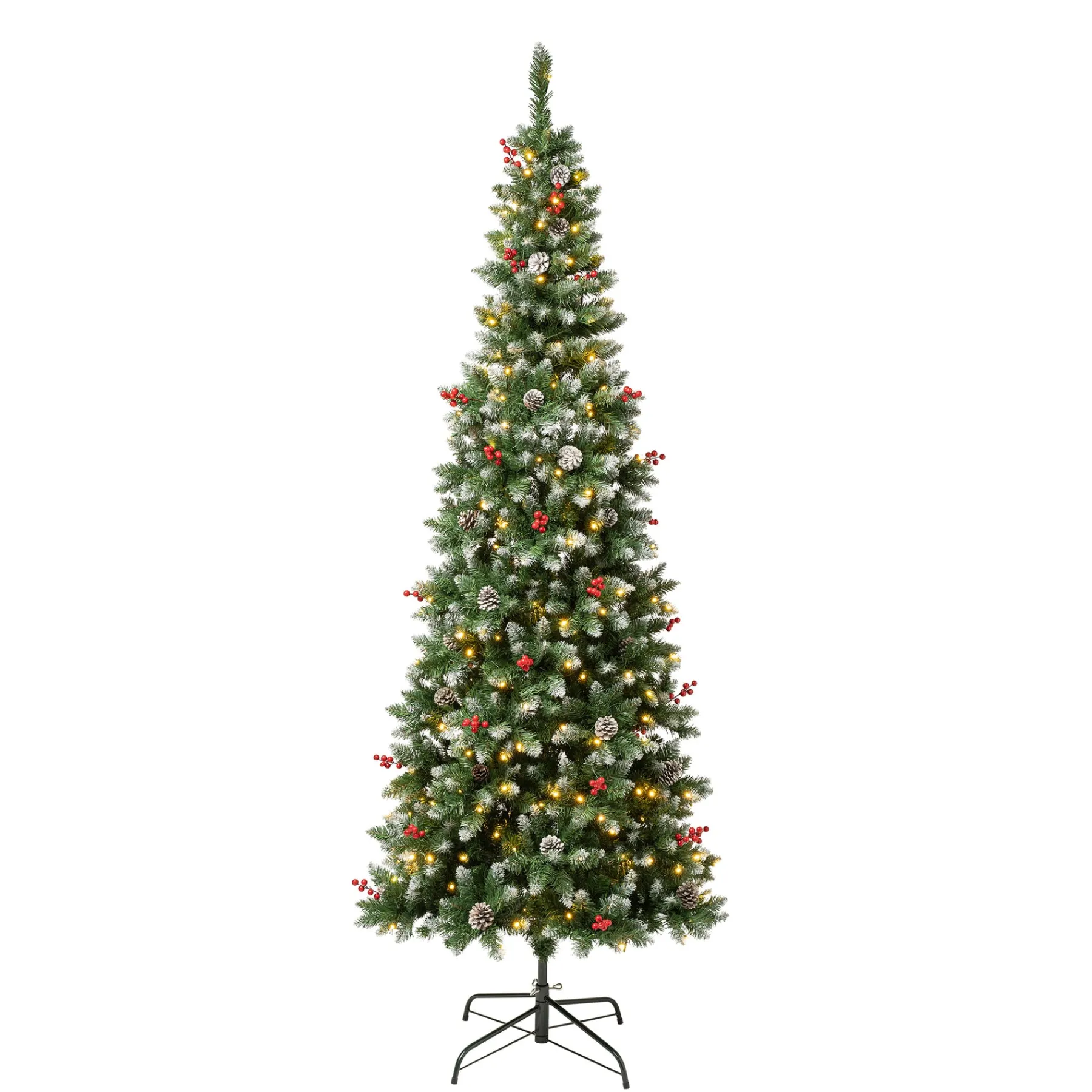 - Create New Christmas Memories With The Cullen Slim Hinged Tree. Trimmed With Berries And Pinecones And Pre-Strung With 300 Multi Led Lights, This Tree Exuberates Holiday Cheer. This 7.5Ft Slim Silhouette Tree Is Perfect For Rooms With Limited Space. Features Pre-Attached Hinged Branches For Easy Assembly. Welcome In The Holidays With This Festive Tree.