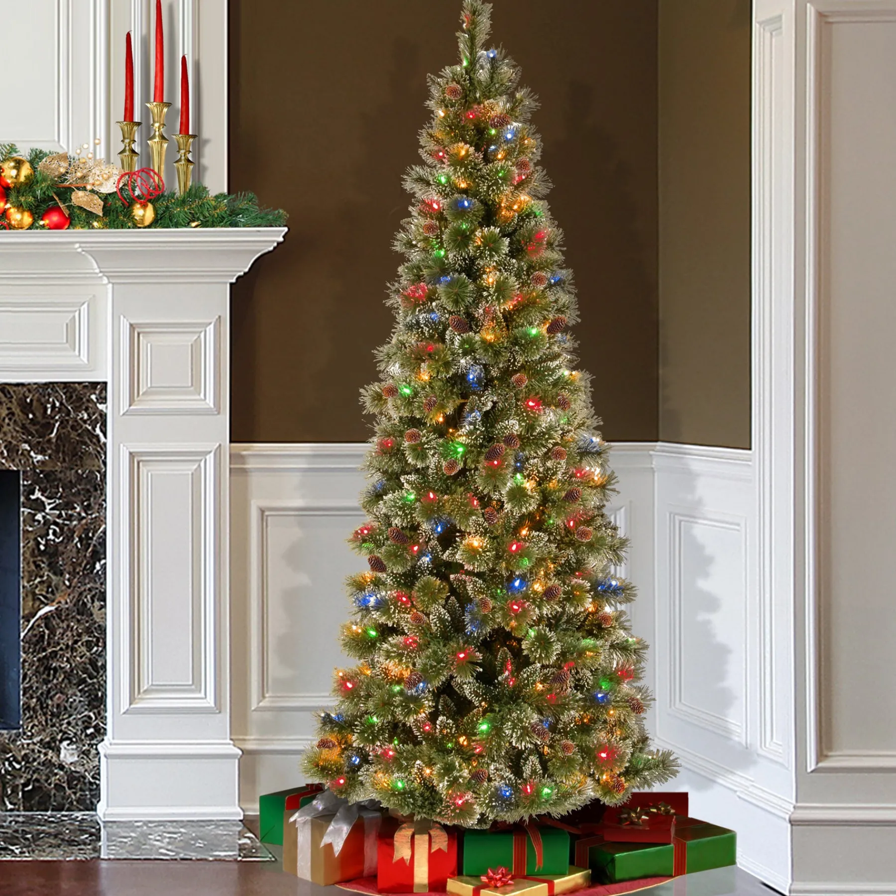- This Glittering Pine Artificial Green Slim Christmas Tree Is 9 Feet Tall With A 36 Inch Base Diameter. Featuring Hundreds Of Individually Crafted Branch Tips To Create Full Bodied Branches, This Tree Is Designed To Look And Feel Lifelike. Decorated With P