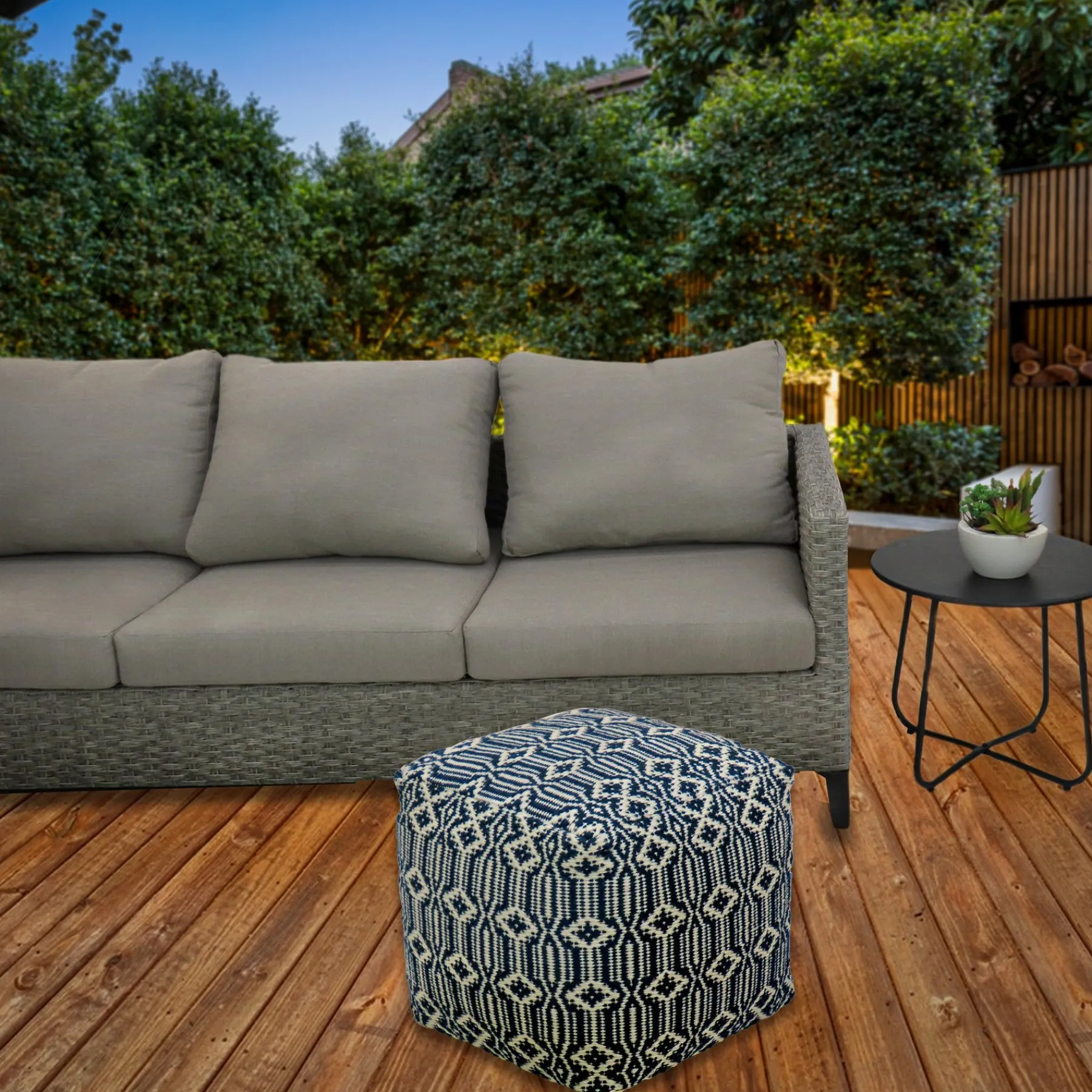 Convenient, Comfortable, And Stylish, This Pouf Ottoman Is A Multipurpose Furniture Piece Offering Uses As A Portable Seat, Footrest, Or Tabletop. Soft Yet Solid, It Is Constructed With A Polystyrene Bean Fill And Features A Strong Hand-Woven Sustainable Polyester Cover Designed To Endure Outdoor Environments. Dress Up An Interior Or Exterior Space With This Versatile Pouf Featuring A Repeating Pattern In Navy Blue Color, An Accent Piece That Offers Both Form And Function.