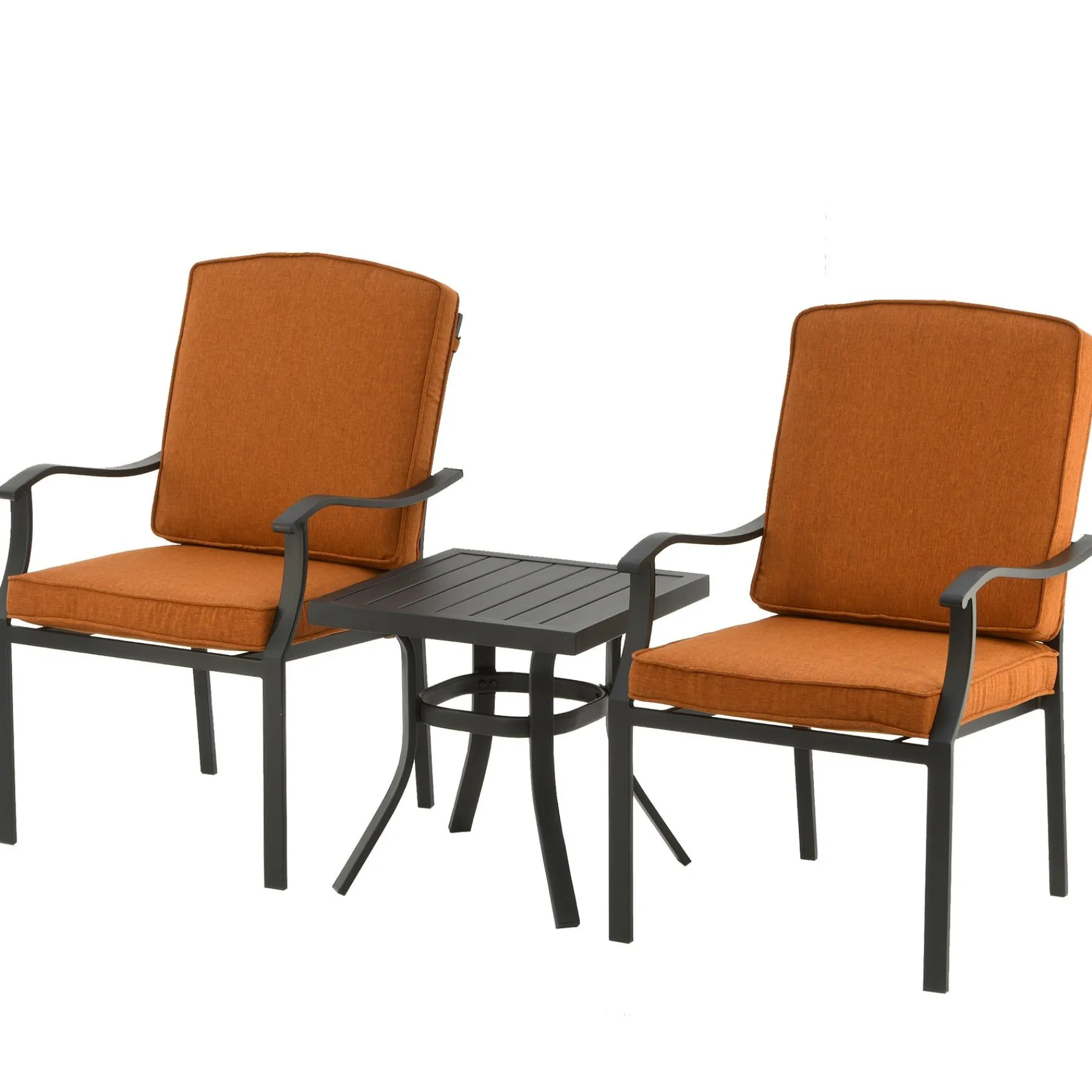 This Contemporary Styled Indoor/Outdoor Club Set Is Constructed With A Strong, Yet Lightweight Steel Framing That Is Powder-Coated, In A Black Finish, That Is Designed To Withstand Harsh Outdoor Elements. Both High-Back Chairs Include Armrests For Added Comfort. Separate, Removeable Seat And Back Cushions Feature A Water, Mildew And Fade-Resistant Fabric, In A Burnt Sienna Color. The Square Coffee Table Offers A Sturdy Steel Top With An Appealing Straight Slat Design. Pieces Are Easy To Maintain And Care For. Assembly Required.