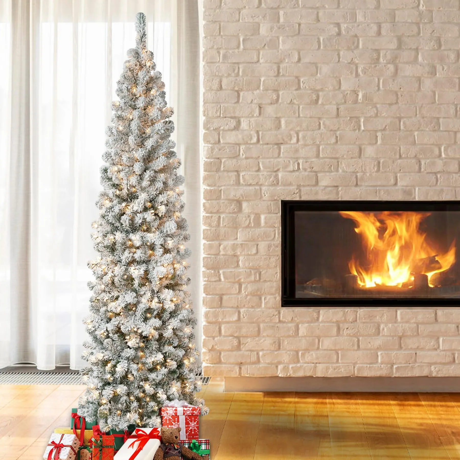 The Acacia Pencil Slim Tree Offers An Extra Thin Profile Making It A Great Choice For Display In Corners Or In Areas Where Floor Space Is Limited. This Tree Features Flocked Branches Giving The Appearance Of Freshly Fallen Snow.
