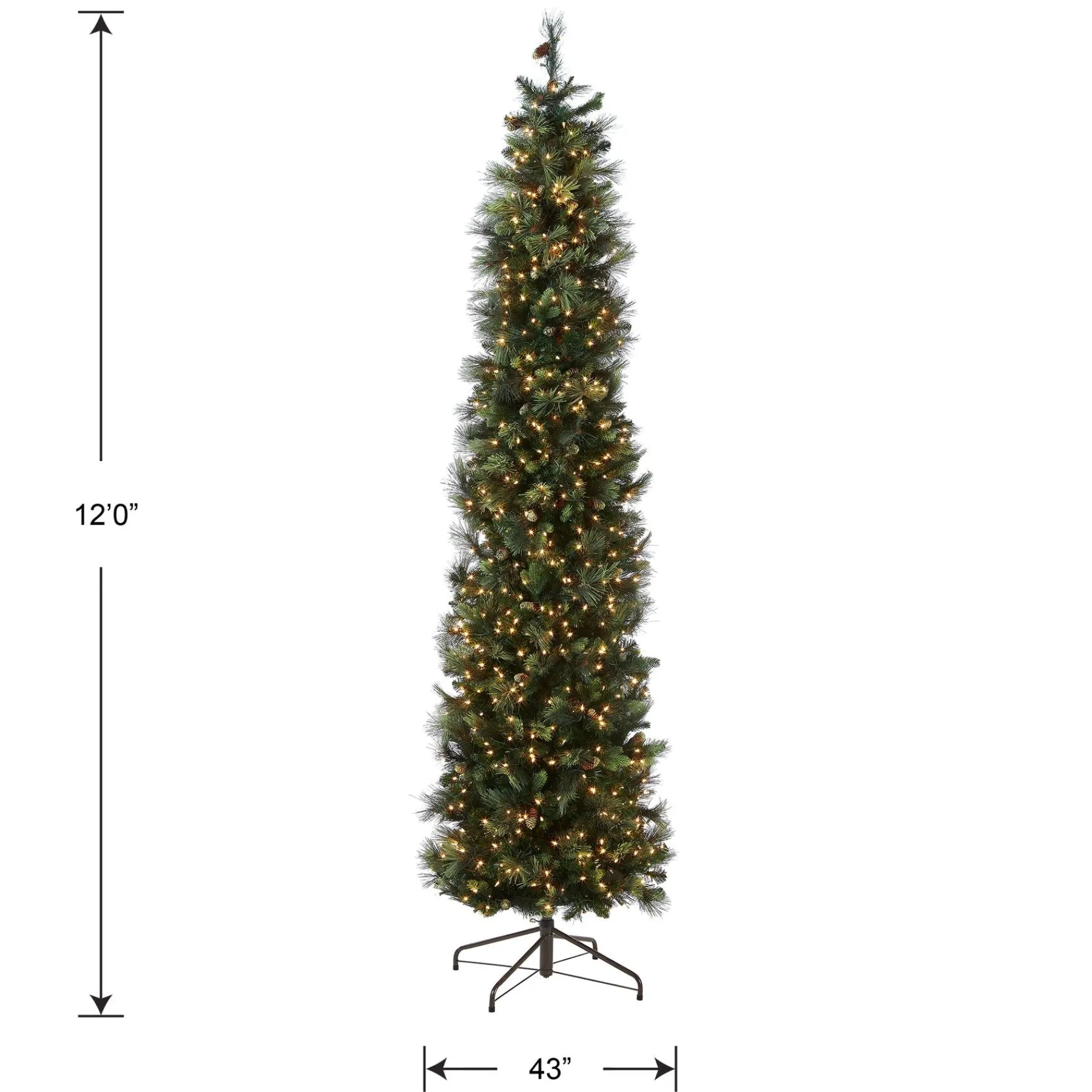 - This Carolina Pine Artificial Green Christmas Tree Is 12 Feet Tall With A 43 Inch Base Diameter. Featuring Hundreds Of Individually Crafted Branch Tips To Create Full Bodied Branches, This Tree Is Designed To Look And Feel Lifelike.