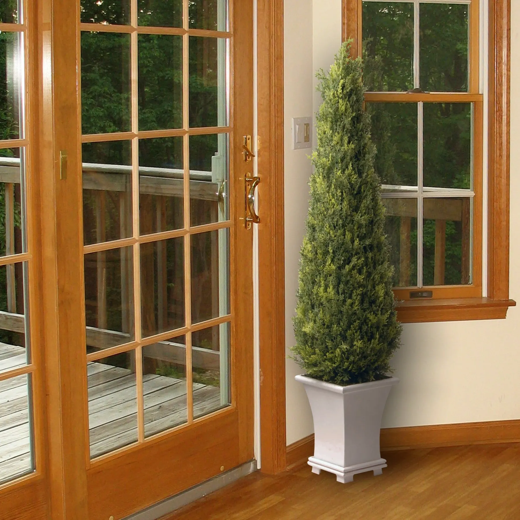 - Includes One Artificial Entrance Tree That Measures 42 Inches In Height And Includes A Stylish, White Base Made Of Lightweight Cokmposite Wood.