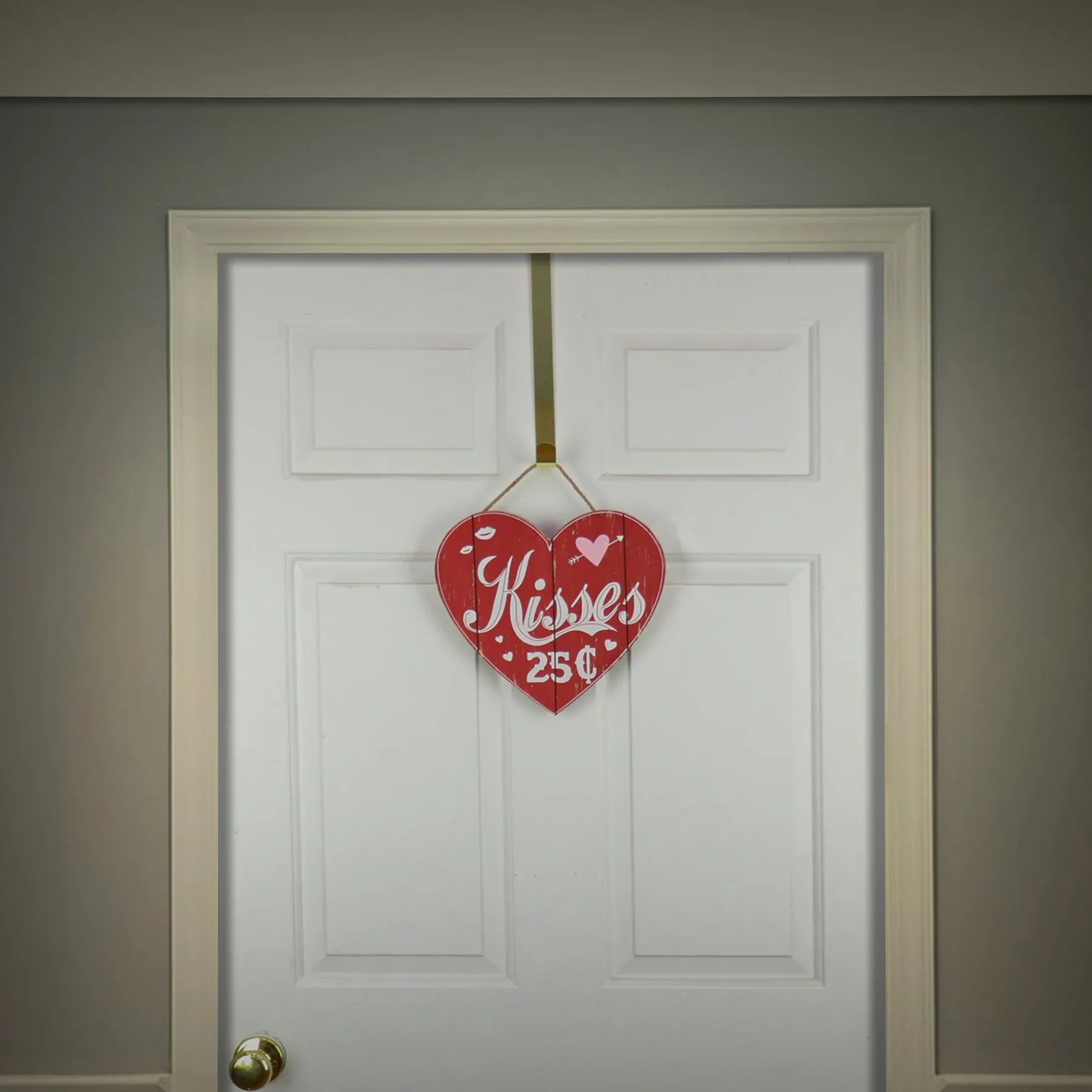 Send The Message To Pucker-Up With This Valentine’S Day Themed Wall Sign. It Is Constructed Of Red Painted Lightweight Wood Material With Slatted Wood Grain Design Featuring The Message “Kisses” In Flowing Script Letters Followed By “25¢” Right Below. A Motif Of Hearts And Lips Float Around The Printed Characters. Display This Fun Decorative Piece On Door, Wall, Or Window In Indoor Locations. Includes Sisal String Loop For Hanging.