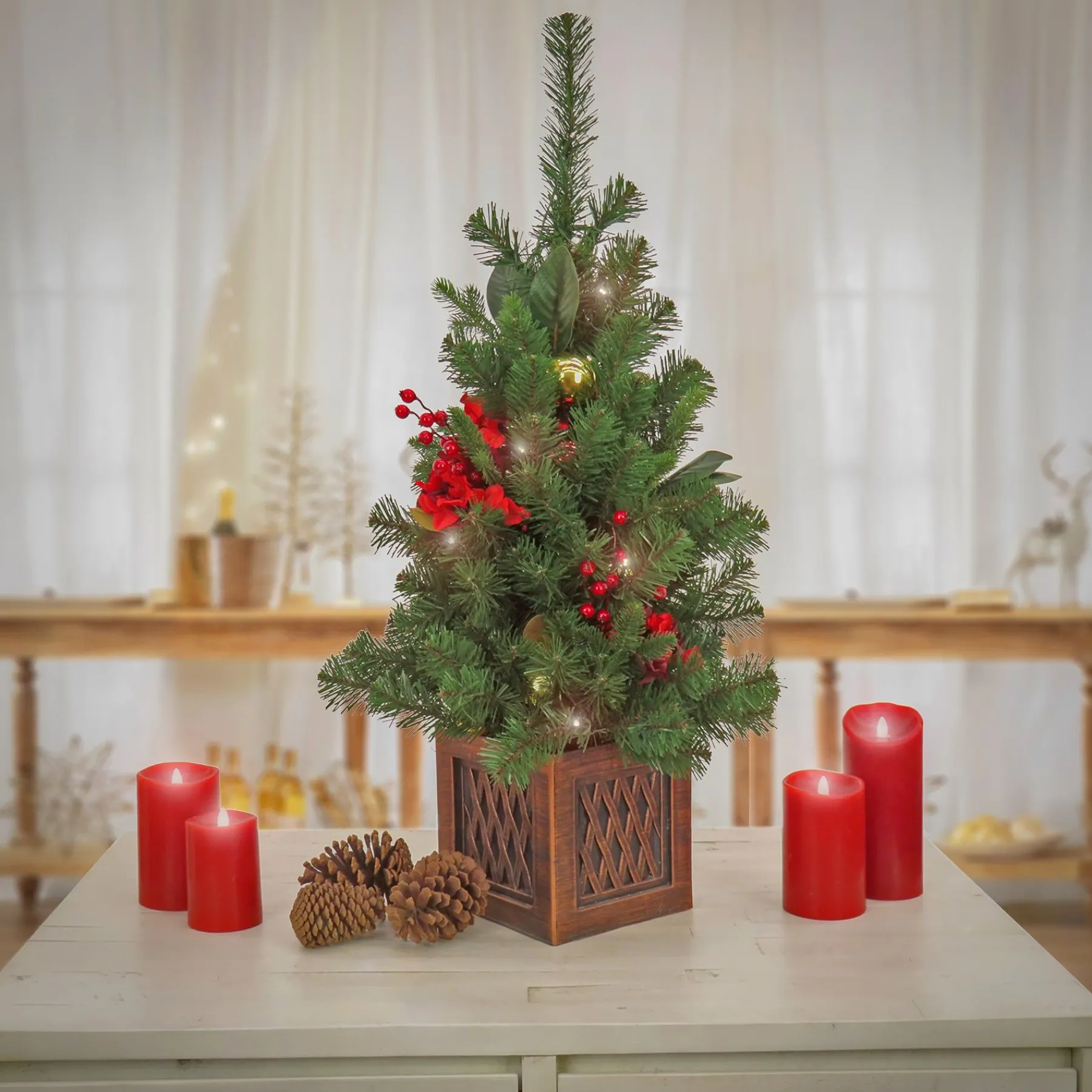 Celebrate The Holidays With The 36″ Christmas Vienna Waltz Table Top Tree. This Table Top Tree Is Pre-Strung With 35 Warm White Battery Operated Led Lights With Remote Control. Trimmed With Ornaments, Leaves, Flowers, Natural Pinecones, Berries, Andseated In A Plastic Pot, This Tree Is A Charming Addition To Your Home.